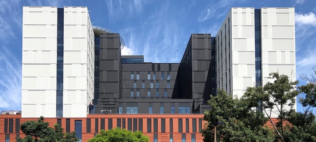 Clad in both Rieder Concrete Skin and Tempio porcelain tile cladding from DCA Façade both cladding materials were selected for there suitability and longevity in the Hospital environment.