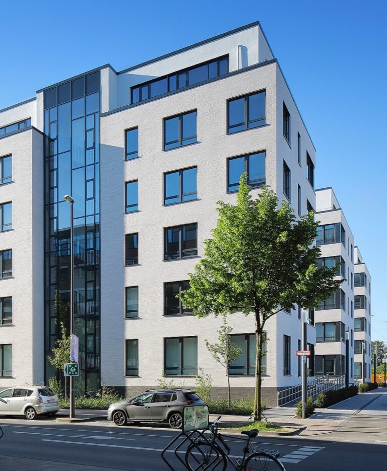 The deliberately chosen architectural firing and hand-sorted brick slips set coloured accents on the facade, which integrate particularly harmoniously with the surroundings. This takes the harshness out of the consistent modern architecture and communicates a playful ease that is found throughout the entire residential area.