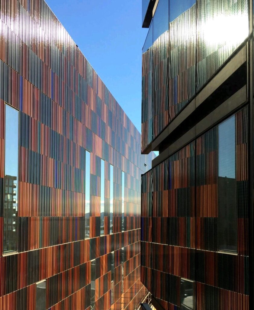 Within this remarkable building, two of its facades stand as magnificent public art installations. One facade features a stunning glass design spanning an impressive 2,400 square meters, while the other boasts a captivating ceramic design covering an expansive 3,360 square meters.
